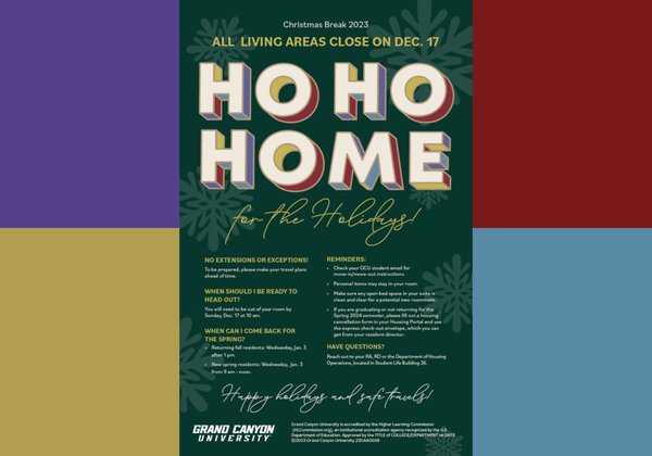 Working with four other Assistant Copywriter/Assistant Graphic Designer groups, we were tasked with developing an informational Christmas Break move-out campaign for Grand Canyon University students. The challenge was to make the design stand out among all the other Christmas material posted across campus.